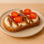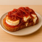 Tosta con mermelada de tomate, rulo de cabra, cebolla